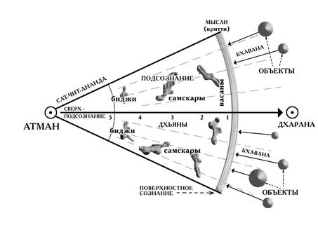 У обычных людей мысли возникают хаотически, спонтанно, тогда они переживают различные страдания. Вся жизнь обычного человека проходит вот на этой периферии. Конечно, у него есть глубокое состояние подсознания, глубинное состояние сознания, но он о нем не подозревает. У него есть сверхподсознание, состояние Атмана, но о нем он также не подозревает. Из-за того что мысли идут сплошным потоком и сознание находится в этом внешнем слое, человек чувствует себя отчужденным, отделенным от высшей духовной реальности (Атмана).